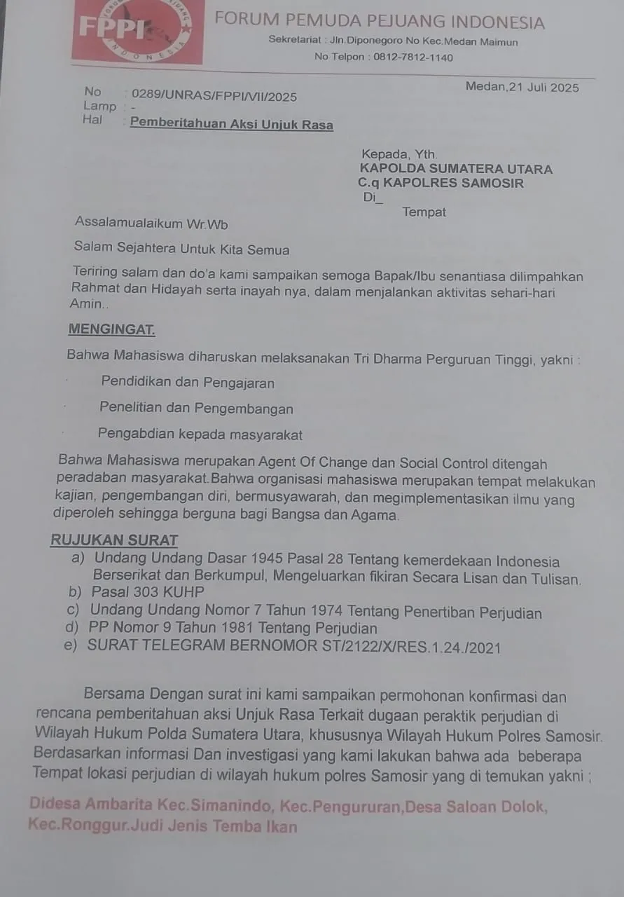 fakta62news.com, | Forum Pemuda Pejuang Indonesia Sumatera Utara akan menggelar aksi unjuk rasa di Mapolda Sumut pada 30 Juli 2025. Mereka mendesak Kapolda Sumatera Utara untuk memanggil dan memeriksa Kapolres Samosir serta jajarannya terkait dugaan praktik perjudian jenis tembak ikan di Kabupaten Samosir.