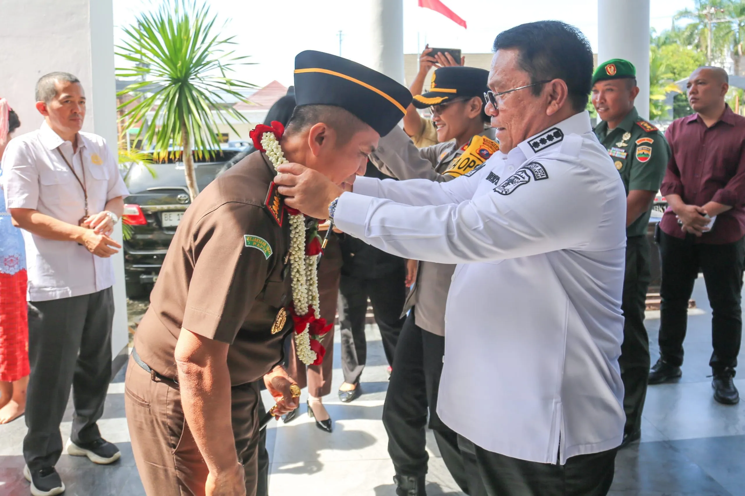 Wali Kota Pematangsiantar Wesly Silalahi menyambut hangat kedatangan Kepala Kejaksaan Negeri (Kajari) Pematangsiantar yang baru, Erwin Purba, di Kantor Kejari Pematangsiantar pada Rabu (23/07/2025). Wesly mengalungkan bunga kepada Erwin sebagai tanda ucapan selamat datang.